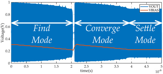 As analyzed above, PVT variation is severe for VCOs operating in Class-C, and a different bias voltage is required according to each situation. In [4,8,9], regarding the bias control of Class-C VCO, the optimal bias voltage was found using a specific reference voltage level from the outside. In order for a circuit to actually be used, it is difficult to find an optimal point in a different situation each time. Therefore, we tried to construct an algorithm, so that the circuit could adjust the bias voltage close to the optimal point by itself in a given situation. Figure 5 shows that the bias voltage of the oscillator showed the best phase noise just before it was turned off. Using this, the algorithm was configured to detect the bias point where VCO was off and to converge near the off point. The transient response plot of VCO to which this algorithm was applied is shown in Figure 6.