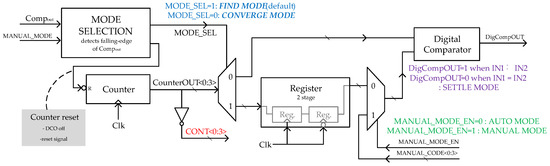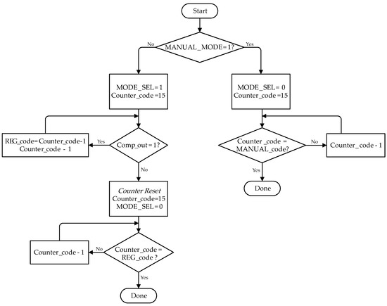 Figure 7 shows the creation of the above bias calibration concept as a flow chart. Figure 8 is the structure of a digital block designed x on the basis of the flow chart. This calibration block consists of the counter, register, Mode Selection block, digital comparator, MUX, and DEMUX. The counter is reset when the VCO is OFF or the external reset signal is applied. Along with the clock signal, the counter makes the bias codes for the bias circuit, which is represented as CONTS<0:3> in the figure. The Mode Selection block detects the falling edge of the comparator output which means the ON/OFF state of the oscillator. From this information, the Mode Selection block distinguishes whether the current calibration state is or . When it is , the counter output is saved at the register and when it is in the , the saved code is compared to the counter output until these two codes are equal. This comparison process is conducted at the digital comparator block. When the counter output becomes equal to the saved codes, the output of the digital comparator stops the clock signal of the whole calibration block.