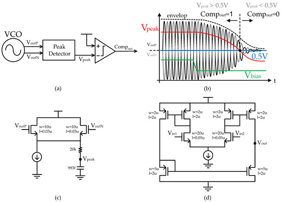The most important function in is VCO OFF detection. The ON/OFF state of VCO should be recognized and expressed in digital code. When the VCO is turned off, the swing decreases rapidly. The rapid change in the swing level may be detected using a peak detector and a comparator [12]. The circuit for OFF detection and its transient response is shown in Figure 9. To this end, VCO output is received as a peak detector, which detects the envelope of the swing of VCO oscillation swing. signal is compared to the reference voltage, which was set to 500 mV in this paper. This reference voltage is connected to the supply voltage. This value is designated as a value that can determine ON/OFF on the basis of the value of through simulation. When PVT variations are given, this value may change. However, this change is insignificant, so there is no problem in catching the rapid change in . Then signal expresses the ON/OFF status of VCO as 1 and 0. Using this value, transition from to is possible.