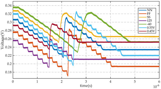 In addition, Figure 12 shows the transient simulation results of bias voltages of the VCO with bias calibration with 7 corner variations (NN, FF, SS, 125 °C, −40 °C, 0.55 V, 0.45 V) applied, and bias calibration operated well in each corner. The start-up time of this VCO was less than 10 ns. The entire calibration loop time differs by PVT variations, but the time was less than 5 s in all cases. As a result, all cases with PVT variations were starting up well.