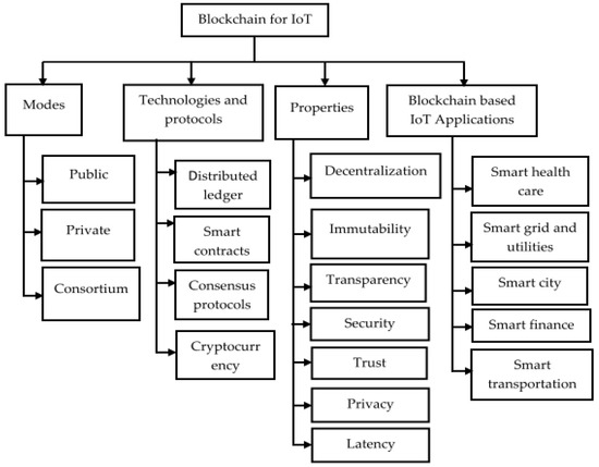 Most of the current survey studies classify blockchain approaches based on architectural components and the mode of blockchains [9,16,26]. We adopted and derived our classification from blockchain technologies [27], as well as blockchain applications [28], supported by the literature with more relevant blockchain approaches. In fact, we present a broader categorization of blockchain-based IoT applications. We classify additional blockchain modes, protocols, technologies, and properties that are critical in providing security and privacy solutions for IoT applications, as shown in Figure 1.