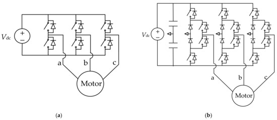 Three-phase synchronous and asynchronous motors are the most popular, while they are often driven by a conventional two-level three-phase DC–AC voltage source converter, made of three two-level converter legs, as depicted in Figure 1a. However, the motor voltage, current, and corresponding power ratings vary substantially from one application to another, and this requires the use of different suitable power devices to configure the inverter for each case. An alternative solution is to use a multilevel topology to configure the motor drive, such as in the simple three-level example of Figure 1b. In this case, from a given robust power device with optimized performance and low cost, a range of motor drives at different voltage and power ratings can be configured by simply adjusting the number of levels. In addition, the multilevel converter brings additional benefits in terms of efficiency, harmonic distortion, electromagnetic compatibility, etc.