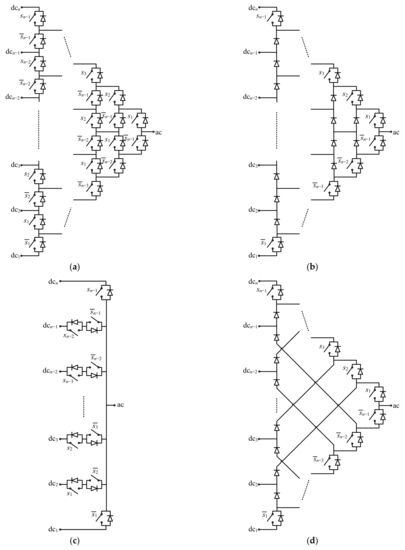Several circuit topologies are possible to build such converter legs. The main topologies are shown in Figure 3 [9]. All of them combine a number of transistors and diodes to perform the single-pole multiple-throw switch function. Figure 3a presents the active or transistor-clamped NPC (ANPC) version of the topology built with a pyramidal connection of a single type of transistor with antiparallel diode, with a voltage rating equal to one elementary voltage level Vdc/(n − 1). Removing the inner transistors from the pyramid leads to the passive or diode-clamped NPC (PNPC) version of the topology, as shown in Figure 3b. The topologies in Figure 3a,b require a substantial number of devices, especially as the number of levels increases. In order to reduce the number of devices, some of the devices in Figure 3a,b can be combined into other devices with higher voltage rating, leading to the reduced ANPC and PNPC topologies shown in Figure 3c,d. Other topologies can be found in the literature designated as NPC but are in fact hybrid topologies combining the former topologies with others such as the flying capacitors. In this paper, these hybrid topologies are not considered, although the presented modulation strategy can be also adapted to many of them.