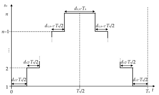 With the previous values of the phase duty ratios, each converter leg can be then directly controlled, applying the switching states from Table 1, in each switching cycle with period Ts, to produce the sequence of connection to the DC-link points illustrated in Figure 5.