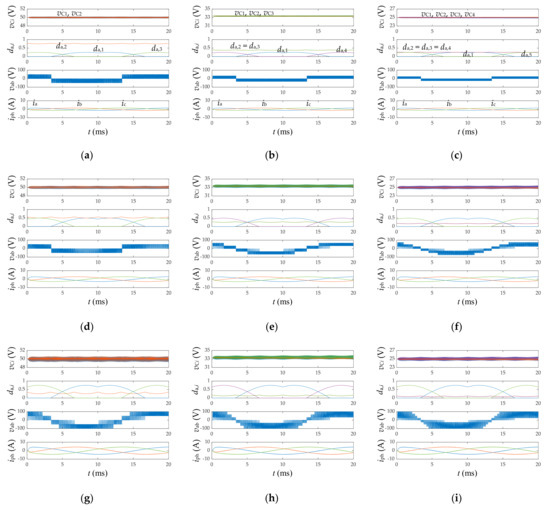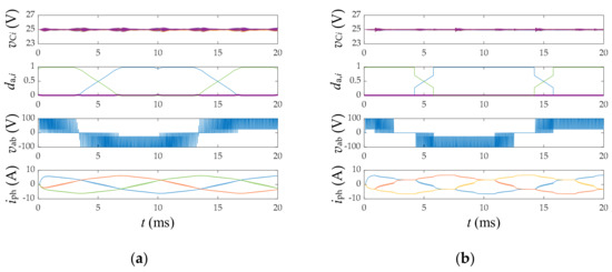 Using Equation (4), Figure 7 extends the application of the VVPWM strategy to a higher number of phases. As observed in Figure 7b,c, the shape of the phase duty ratios varies as the number of phases increases, showing a pattern slightly more complex than that in the three-phase case shown in Figure 7a. However, all capacitor voltages remain balanced in every switching cycle, and a proper overall performance with balanced and sinusoidal phase currents is achieved.