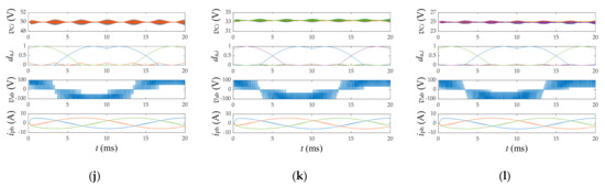 Simulation results for the three-phase NPC DC–AC conversion system of Figure 4, operated with the proposed VVPWM strategy formulation, under different modulation index values m and numbers of levels n in the undermodulation range (hbc = 1). (a) m = 0.25, n = 3; (b) m = 0.25, n = 4; (c) m = 0.25, n = 5; (d) m = 0.5, n = 3; (e) m = 0.5, n = 4; (f) m = 0.5, n = 5; (g) m = 0.75, n = 3; (h) m = 0.75, n = 4; (i) m = 0.75, n = 5; (j) m = 1, n = 3; (k) m = 1, n = 4; (l) m = 1, n = 5.
