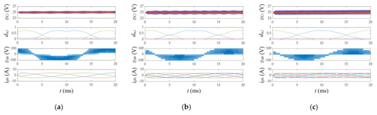 Simulation results for an NPC DC–AC conversion system, operated with the proposed VVPWM strategy formulation, under m = 0.75, n = 5, and different numbers of phases. (a) Three phases; (b) five phases; (c) seven phases.