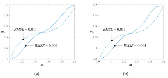 Effective modulation index (me) as a function of the commanded modulation index (m) in the overmodulation region for two cases: algorithm implemented with Algorithms 1 and 2 (solid line) and algorithm implemented with Algorithms 2 and 3 (dashed line). (a) hbc = 1; (b) hbc = 0.98.