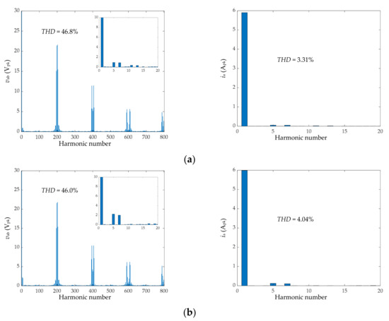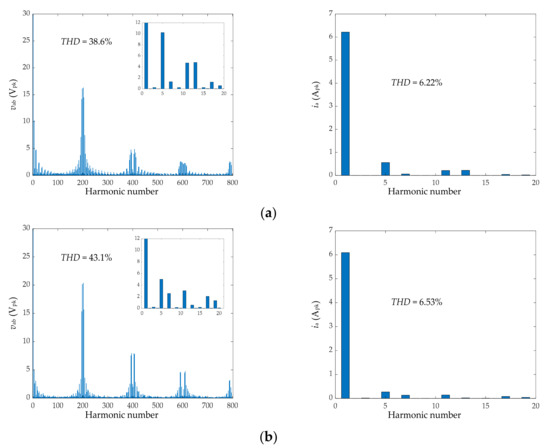 Line-to-line voltage and phase current harmonic distortion under m = 1.025 and hbc = 1. (a) Algorithm implemented with Algorithms 1 and 2; (b) algorithm implemented with Algorithms 2 and 3.