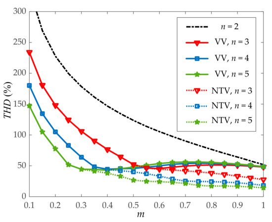 Total harmonic distortion of the line-to-line voltage in a three-phase multilevel NPC DC–AC converter operated with the VVPWM and operated with a reference NTV PWM [17].