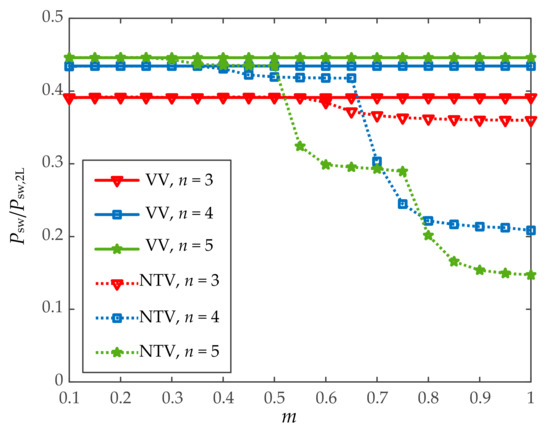 Switching power loss in a three-phase multilevel NPC DC–AC converter operated with the VVPWM and operated with a reference NTV PWM in per unit value of the switching power loss of a two-level converter [17].