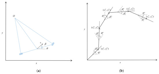 To precisely control and localize the movement of an autonomous vehicle, a digital model of the vehicle ego-motion should be established. This paper utilizes a typical kinematic model to reflect the vehicle characteristics accurately, also called the Ackermann steering geometry. Figure 1a is a schematic diagram of the Ackermann model. Here, O is the rotation center of the vehicle, is the slip angle, is the heading angle, and v is the velocity.