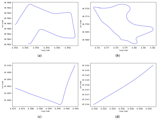 (a–d) The four global trajectories of the vehicle.