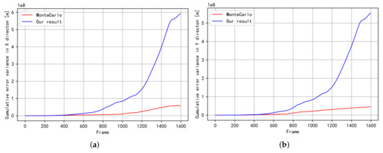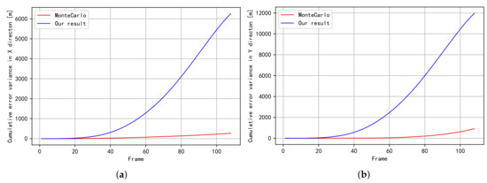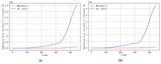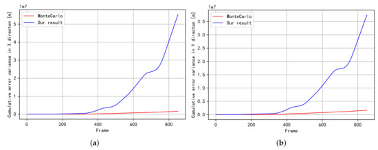 The variance of cumulative error for trajectory (Figure 2b). (a) The variance of cumulative error in the X direction; (b) The variance of cumulative error in the Y direction.