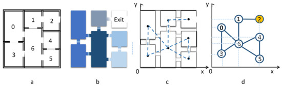 The structure of large public places can be complex, and people can be highly concentrated. Thus, the formulation of evacuation networks is very important for such common places [31,32]. In an evacuation network, each subspace is regarded as a network node, and each subspace has certain attributes, including central coordinates, area, and maximum capacity. Figure 1 shows the construction process of an evacuation network. The evacuation scenario has seven subspaces and one exit, as shown in Figure 1a. Figure 1b is obtained according to the connection and separation relationships among subspaces and exits. In Figure 1c, the coordinates of the center points of each subspace is abstracted and marked as a node, and the connecting line between two connectable subspaces is regarded as an edge. The final evacuation network is shown in Figure 1d.