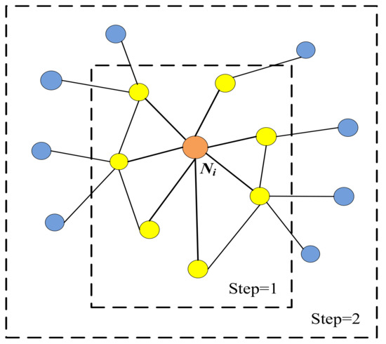 Since the evacuation network in our model is represented as a discrete graph, the visual field should be discrete. A discrete visual field refers to a set of nodes which can be perceived by artificial fish. It is determined by a parameter defined as . The discrete field of vision of artificial fish is shown in Figure 2. Assuming that the current artificial fish is at node , its visual field is different according to the value of . As shown in Figure 2, indicates that the artificial fish can perceive the nodes directly connected with its current node. means that the visual field the current artificial fish is wider, and the nodes within two steps connected with the current node are included in the visual field.