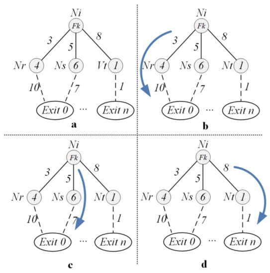 Figure 3 shows the selection of an artificial fish at the next moment in the evacuation process through three basic behaviors. Figure 3 is the diagram of these different behaviors. In Figure 3a, at this moment, the artificial fish is located at node . Nodes , , and are connected with in the visual field of . The current number of individuals at each node is marked inside the node symbol, and the distance between two nodes are labeled on the corresponding edge.