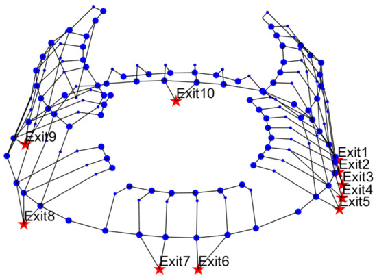 The evacuation model was applied to the Wuhan Sports Center Stadium in China. The stadium can accommodate up to 60,000 people. As shown in Figure 5, there are 42 stands and 10 exits in the stadium. The stands, bleachers, stairs, exits, and passages are considered as nodes to construct the evacuation network, and there are 157 nodes in total.