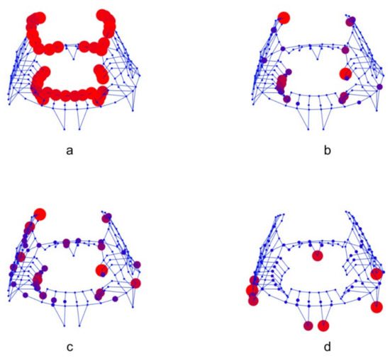 Aside from maintaining the same high evacuation efficiency, the distribution of evacuees of the AFSAP algorithm was analyzed. Figure 7 shows the distribution of 25,000 persons. The node’s color and size vary according to the current number of persons at the node. The more people there are, the bigger the node is. Figure 7a–d show the population distribution at the beginning, 100 s, 200 s, and 300 s, respectively. Figure 7d shows that the numbers of individuals at 10 exits are relatively evenly distributed, which indicates that the utilization degree of 10 exits is relatively balanced. The reasonable and balanced utilization degree of exits is essential for emergency evacuation because congestion at some certain exits may lead to serious secondary disasters.