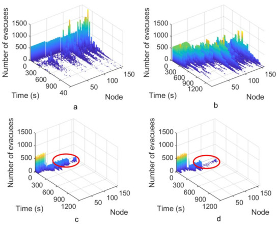 Figure 8 shows the temporal-spatial congestion of the ACO, HMERP, HDAFSA and AFSAP algorithms. The four methods have quite different distributions of temporal-spatial congestion. The height of the histogram represents the number of evacuees. When the number of people at one node becomes larger, the color changes from blue to yellow. The congestion values shown in Figure 8a,b are much higher than those in Figure 8c,d. It demonstrates that the congestion condition of the HDAFSA algorithm is less serious than that of the ACO and HMERP algorithms. The differences between HDAFSA and AFSAP are not apparent. However, the marked areas in Figure 8c show that some nodes are crowded. As shown in Figure 8d, the AFSAP algorithm fully considers the advantages of AFSA and ACO. It can ensure good congestion control and improve node utilization in order to further reduce congestion and improve evacuation efficiency.