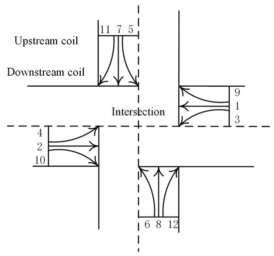 An intersection, named Dongying Economic Development Zone located in Shandong Province in China, is employed to verify the effectiveness of the proposed algorithm for the adaptation scheduling of urban traffic lights, including four directions, four phases, and three lanes. Let us take one of the roads: the lanes in one direction are divided from left to right into one left-turning lane, one straight-going lane and one right-turning lane. The lanes are 3.5 m wide. Each vehicle follows a fixed route, which is engendered at random. The corresponding relationship between the four directions of intersection and each gate is shown in Figure 6.