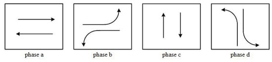 For example, a typical intersection with four phases is displayed in Figure 1, in which the corresponding phases are shown in Figure 2. The preset order is . Thus, a 4-phase controlled intersection can be formulated, in which the duration of a signal cycle is comprised of four time slices corresponding to the four phases of a green-light signal respectively.
