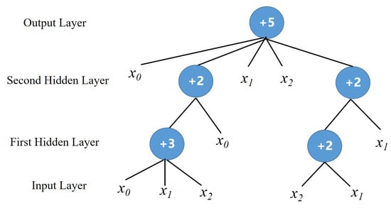 In this paper, the flexible neural tree is designed to predict the phase traffic flow in the next-time frame, which is an alternative tree structural neural network that solves the problem of structural design in the traditional neural networks [,]. A typical FNT model is displayed in Figure 4.
