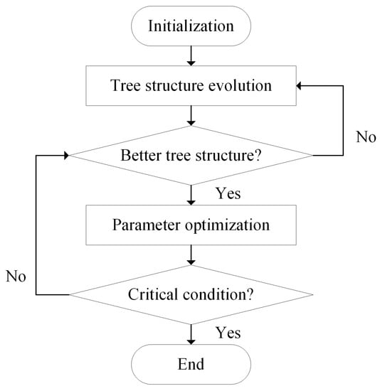 The process of generating a flexible neural tree consists of two main parts, namely the tree structure optimization and parameter optimization. This is shown in Figure 5. Grammar-guided genetic programming (GGGP) is employed to optimize the structure of the FNT, and particle swarm optimization (PSO) is introduced to optimize the relevant parameters. The pseudocode of PSO is shown in Algorithm 1.