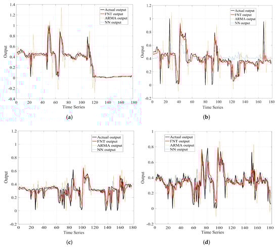 Comparison results of the traffic flow prediction under ARMA, NN, and FNT at 8 o’clock. (a) The comparison results of traffic flow prediction on gate 2. (b) The comparison results of traffic flow prediction on gate 5. (c) The comparison results of traffic flow prediction on gate 7. (d) The comparison results of traffic flow prediction on gate 8.
