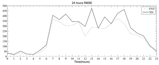 After that, the comparison results under different prediction algorithms are displayed to prove the effectiveness of FNT, including autoregressive moving average method (ARMA), neural network (NN), and FNT. Furthermore, the prediction results of traffic flow on four gates at 8 o’clock, obtained from the ARMA, NN, and FNT, are shown in Figure 8, where the x-axis and y-axis represent the number of time series and the normalized prediction number of traffic flow, respectively. Figure 9 shows the 24 h RMSE values in gate 2 under FNT and NN, in which the x-axis represents the 24 h in a day, and y-axis represents the RMSE value for 1 hour. Meanwhile, the comparison results between real traffic flow data and forecast data of gate 2 are shown in Table 1.