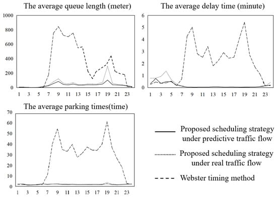 Three performance indices are selected to evaluate the scheduling traffic light methods, including the average queue length, the average delay time, and the average parking time. Based on the prediction results of traffic flow on a certain day obtained from Section 5.1, the comparison results under different traffic light methods are shown in Figure 10, including Webster timing method, the proposed scheduling algorithm under real and predictive traffic flow, where x-axes represent 24 h in 1 day.