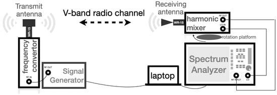 The architecture of the channel sounder is presented in Figure 1. We use a signal generator type R&S SMB100A and spectrum analyzer type R&S FSVR40 to perform angular PL measurements. The signal generator generates a radio frequency (RF) source in the frequency range 8.3 GHz to 12.5 GHz, which is up-converted to the V-band via a frequency multiplier type R&S SMZ75 with multiplication factor 6. The signal is transmitted with 5 dBm output power using an omnidirectional antenna type Mi-Wave 267V/385 with a gain of 3 dBi and gain variations of 2 dB over the complete band. The transmit (TX) antenna has an elevation half-power beamwidth (HPBW) of 45 and is connected via a WR-15 rectangular waveguide. The signal is captured by a directional horn antenna type Steatite QSH-SL-50-75-V-20 with a gain of 20 dBi, and down-converted to an intermediate frequency (IF) in the range 5 MHz to 2 GHz, using a harmonic mixer type R&S FS-Z75. The receiving (RX) antenna has an HPBW of 18 at 60 GHz in both the elevation and azimuth plane. The harmonic mixer has a conversion loss of 18 dB and uses a local oscillator in the frequency range 8.0 GHz to 12.8 GHz which is provided by a spectrum analyzer that displays the received power. The analyzer’s displayed average noise level (DANL) is −174 dBm/Hz and the noise figure at the IF port is 3 dB. The mixer’s conversion loss is taken into account by the spectrum analyzer, and the cable losses and noise figure of the equipment are calibrated out. Therefore, the error margin is mainly defined by the gain variations of the antennas.