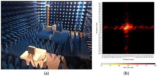 IEEE 802.11ad Terragraph platform validation in anechoic room, with a distance of 2 m between the antennas. (a) Measurement setup; (b) Angular path loss profile.