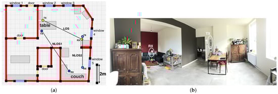 Living room environment. (a) Floor plan; (b) Picture of non-Line-of-Sight (NLOS) measurement setup NLOS2 with obstructed path distance 4.7 m.