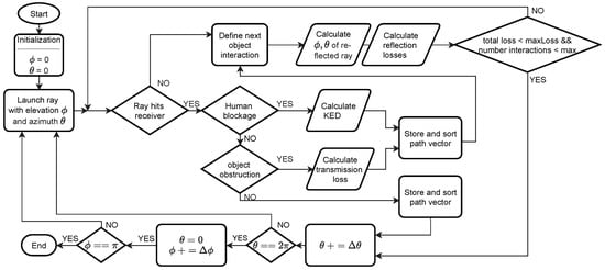 The floor plan is discretized into a finite set of grid points, and at every grid point, we calculate the received power, given a certain access point configuration. For each grid point, we launch rays from the access point in both azimuth (360) and elevation (180) planes with a predefined angle increment, and determine the interactions with the environment. An accurate description of the environment and material characteristics is required for the calculation of reflection and transmission losses. An object is characterized by its relative permittivity, and the loss is calculated via Fresnel reflection and transmission coefficients. A lookup table with reflection and transmission losses for a broad set of materials and incidence angles is implemented, for materials for which the permittivity is not defined. The loss values in the lookup table are taken from [62]. The path information of the best paths is stored, including path loss, total distance, and interactions. The ray-launching algorithm is presented in Figure 4.