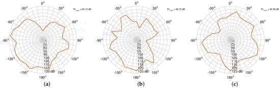 Angular path loss profiles at 60 GHz for Line-of-Sight (LOS) and non-Line-of-Sight (NLOS) scenarios. (a) LOS, distance 4.7 m; (b) NLOS, distance 4.7 m; (c) NLOS, distance 3.4 m.