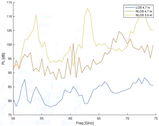 Figure 6 presents the PL as a function of frequency for the 3 scenarios. For each scenario, we show PL for the best path, i.e., for the AoA for which the PL is minimal. As expected, PL increases with frequency, and the measured PL for the LOS link corresponds to the FSPL, considering the gain variations of the measurement antennas. Surprisingly, PL for the shorter link NLOS2 is higher than for the longer link NLOS1. The frequency variations are larger than the gain variation of 2 dB, which shows the frequency selectivity of the channel.