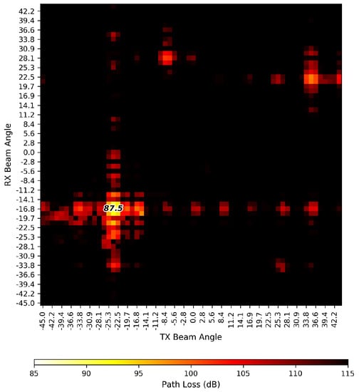 The measured PL is 74.22 dB which differs less than 1 dB from the free space PL (FSPL) of 74.09 dB, but sidelobes are present in the antenna radiation pattern, which results in a cross pattern when visualizing PL as a function of angle of departure (AoD) and angle of arrival (AoA).