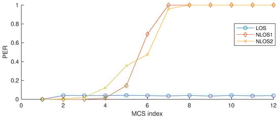 Figure 8 shows the measured PER as a function of the MCS index. For the LOS link, the packet error rate is below 4% for all MCS indices. For the NLOS scenarios, the PER starts increasing from MCS index 4. E.g., for link NLOS2, there is 50% packet loss for MCS index 6. Starting from MCS index 7, all packets are lost. The PER measurements indicate that the throughput estimation of the TG sounder, which is based on the measured SNR, is optimistic, but even for NLOS scenarios, a throughput exceeding 1.25 Gbps is expected, i.e., a data rate corresponding to MCS index 5.