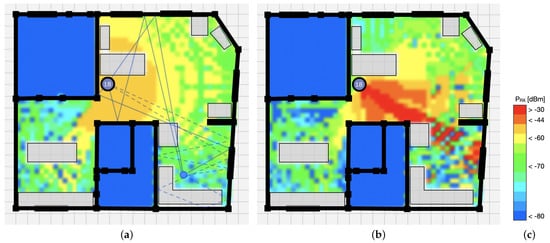We performed simulations using the ray-launching algorithm presented in Section 3 for access point locations corresponding to the TX antenna locations used in the measurements, and we analyzed the multipath components for a grid point corresponding to the RX locations used in the measurements. The simulation time using the settings from Table 2 is 67 min on a notebook computer with a 2.3 GHz Intel Core i5 processor.