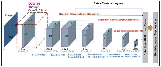 The Single Shot MultiBox Detector (SSD) [] is mainly used to detect target objects in images. It consists of a pretrained VGG16 feature extraction layer and a multi-scale CNN subnet. As shown in Figure 3, the convolutional layers at different depths are used to extract various scale features for bounding-box regression prediction, which is used in classification and object-location detection.