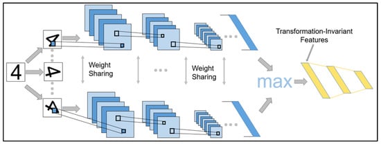 The TI-pooling CNN [], based on LeNet, gives an idea of augmenting a training set by rotating images. The TI-pooling CNN rotates an image with different angles in a training batch and shares the same set of weights in the same batch. As shown in Figure 4, after each rotated image is convoluted, the most significant features from the feature maps for each angle are found by the final max-pooling. The filters of this model can learn a regular pattern from different angles of the same image. It also decreases repeated patterns in the convolution filters generated by standard data augmentation and successfully enhances the rotational invariance of CNN recognition.