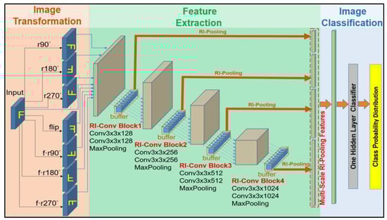 The model has three main parts: image transformation, feature extraction, and image classification. Image transformation is used to rotate an original image for generating images with different angles. Then, feature extraction is executed by four RI-Conv blocks, which are basic convolution units in our model, to capture different-scale image features. Finally, image classification combines the features in different directions and scales for recognizing objects. They are described below.