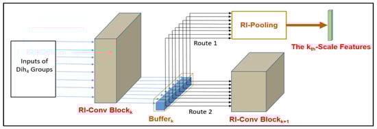 The buffer collects the eight feature groups— to —and sequentially sends them to the next RI-Conv block for further processing. At the same time, they are sent through another route (Route 1 in Figure 6) to the RI-pooling unit to be compressed as the set of features at the k-th scale. The features from all scales are finally used for image classification. Below, we explain how the RI-pooling unit works.