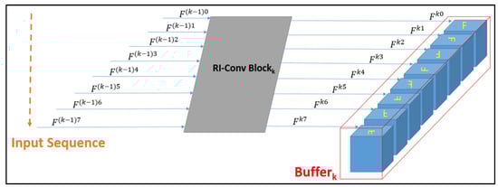Buffers are used to store the output results of the RI-Conv blocks: each such block has a corresponding buffer, which includes eight components. Each component stores the set of feature maps from the respective Dih4 transformed image. Figure 8 illustrates the buffer architecture, where denotes the group of feature maps generated from the g-th Dih4 transformed image in the k-th RI-Conv block.
