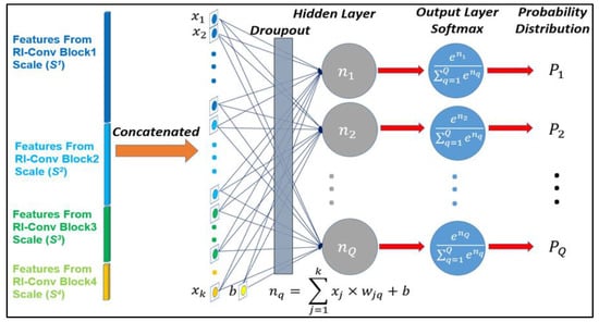 Figure 10 shows the architecture of image classification. The resulting feature maps from the different scales are concatenated. Then, a fully connected neural network is used to classify images. The neural network consists of one dropout, one hidden layer, and one softmax layer.