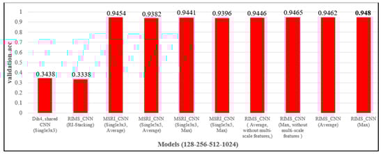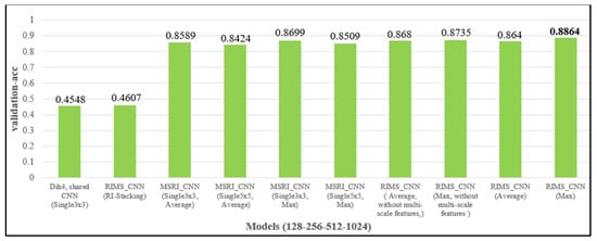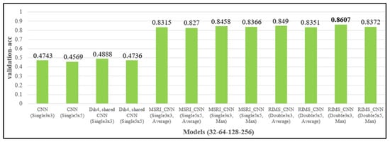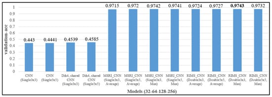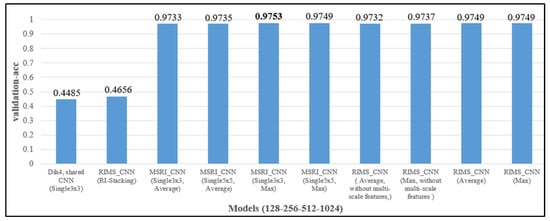 The results from the first four models in the figures show when the Dih4 transformation was applied on a shared CNN, the accuracy was only slightly improved. However, after we applied the multi-scale RI-pooling units, the accuracy was hugely increased. The results also show that our model using 3 × 3 filters in convolution layers mostly had better results than using 5 × 5 filters. According to the results, we used the RIMS-CNN with 3 × 3 filters as our primary model to compare the proposed model with the others in the following experiments.