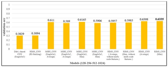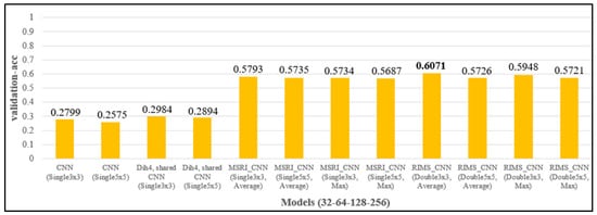 We used different structures but with the same number of filter settings (128-256-512-1024) to evaluate the fixed-angle rotated validating sets. Figure 24, Figure 25, Figure 26 and Figure 27 show the RIMS-CNN had the best accuracy in FASHION-MNIST, CIFAR-10, and CIFAR-100, but not MNIST; however, this had only a 0.004 difference from the best value. We also found that the RIMS-CNN with multi-scale RI-stacking, which is used to stack the eight direction features without pooling, was worse than the RIMS-CNN with multi-scale RI-pooling. Therefore, we cannot use all multi-scale features directly as final classification features. Too many features from each scale significantly drop the classification accuracies.