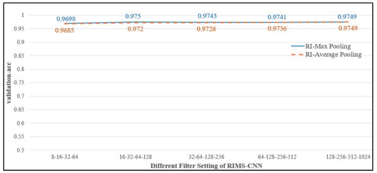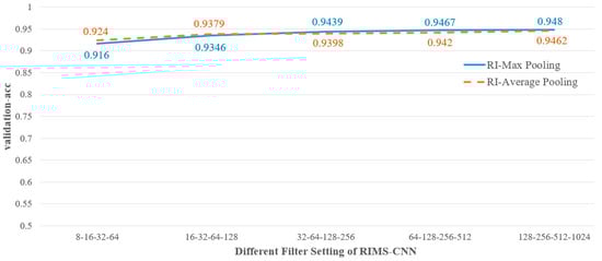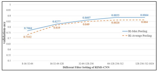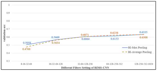 In Figure 16, we can see that the accuracies of RI-max pooling are slightly better than RI-average pooling. Figure 17 shows that the RI-average pooling performs better in the 8-16-32-64 and 16-32-64-128 filter settings, but not by a big difference. In both pooling, the number setting of the 128-256-512-1024 filter has the best accuracy.