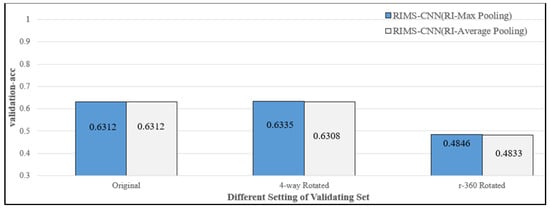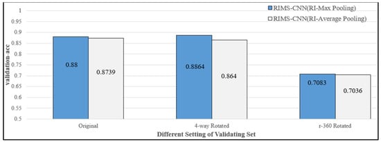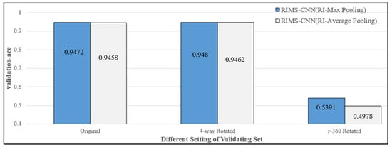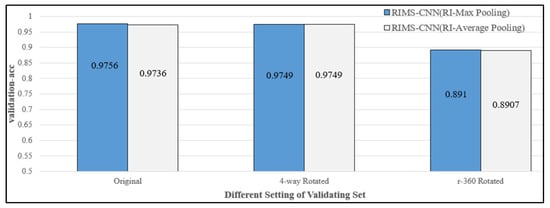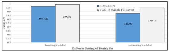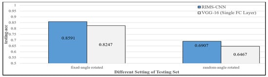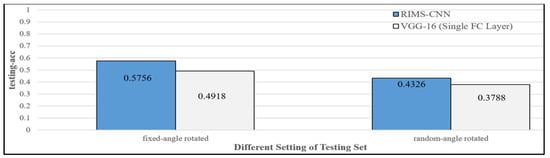 According to the experimental results in Section 4.3.3 and Section 4.3.4, we can see that the validating accuracy of VGG-16 was close to RIMS-CNN. Therefore, we further split each training set into 75% training data and 25% validating data to train the RIMS-CNN and VGG-16 models. Then we evaluated the models on the four testing sets, which were fixed-angle rotation and random-angle rotation. We can see that RIMS-CNN is not as effective as VGG-16 in Figure 28.